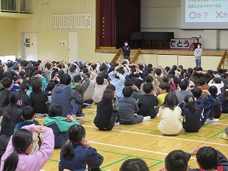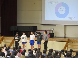 保健委員会が中心となって、「インフルエンザブロック集会」を行いました。2月に入り、どの学年もインフルエンザが流行しています。インフルエンザの予防に大切なことは手洗い・うがい、こまめな換気と加湿です。それらの大切さを劇やクイズを交えてわかりやすく発表してくれました!ハンカチ忘れが多いようです。家を出る時に1度確認するといいですね!
