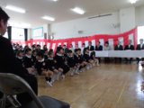 うさぎ組17名の園児が入園してきました。園長の話を聞き、年長児「ぱんだ組」が「深谷幼稚園園歌」を静かに聞いていました。