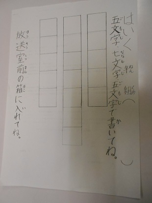 親子で俳句を作ってみませんか。そして、放送室のポストの中に入れてください。親子のふれあいが強まると思います。どんな用紙でもよいので、俳句をつくっていただき、お子さんがポストに入れることをすすめていただけませんでしょうか。よろしくお願いいたします。