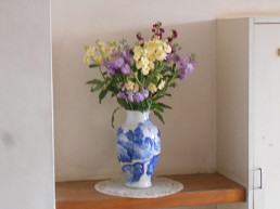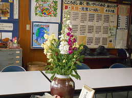 今朝、交通指導をするために玄関に行ってみると、花瓶に入ったきれいな花が生けてありました。校長室の花もきれいな花に代わっていました。