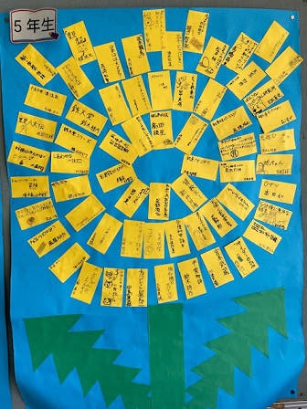 子供たちの東西の玄関を入ったところに、たんぽぽの花の掲示があります。これは、子供たちが自分のおすすめ本を短冊に紹介したものです。