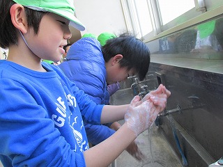 3年生では、手洗いの仕方を工夫しています。「ハッピーバースデー」の歌に合わせ、2回歌いきるまで指の間や手首まで洗います。休み時間ごとに、流しから楽しげな歌い声が聞こえてきます。予防をしっかりして、インフルエンザにかからないようにしたいですね☆