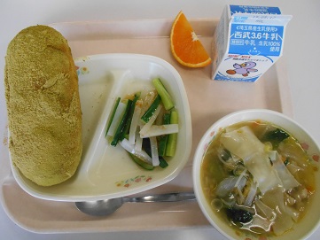 今日の給食は、抹茶入りきなこ揚げパン、牛乳、ワンタンスープ、スティック野菜、清見オレンジ です。