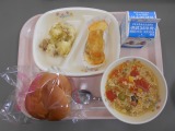 今日の給食は、フラワーロールパン、チキンのこうみやき、ジャーマンポテト、夏風スープ、牛乳です。