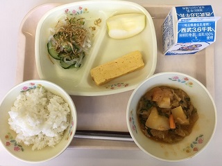 今日の給食は、ごはん、牛乳、じゃがぶたキムチ、厚焼き玉子、ジャコ入り大根サラダ です。