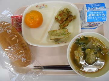 今日の給食は、コッペパン、イチゴジャム、牛乳、すいとん、ちくわの磯辺揚げ、冷凍みかん です。