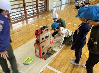12月17日(水)に、近隣の幼稚園・保育園の園児を招待して「秋のおもちゃまつり」を行いました。1年生はこの日に向けて、生活科の秋探しや通学路探検で見つけたどんぐりやまつぼっくりを使ったおもちゃ作りを一生懸命頑張りました。