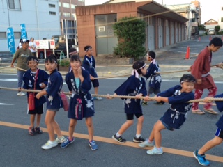 暑かった30日ですが、もっとも暑くなる昼間の時間帯は、お囃子はお休みの時間。子供たちは各自治会館などで、地域の方々と一緒に食事をとったりくつろいだりしていました。ここでは、いつも学校で見せる表情と同じ穏やかで子供らしいものでした。それは、街にくりだした山車を引いているときも同じようでした。