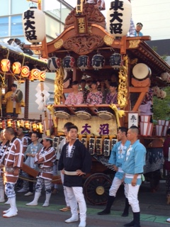 中山道が駅前通が交差するところでのたたき合い。周りの音やリズムに惑わされず自分たちのお囃子を続けるために、仲間の音を確かめながら太鼓や鐘をたたき続けることは難しいと思います。表情からも真剣さが増していることがわかりました。聞いている私の方も、最初は無秩序な音の集合のようにしか聞こえなかったのですが、聞いているうちに、それぞれの山車から発せられるそれぞれのお囃子を区別できるようになり、全体で繰り広げる協奏曲のように思えてきました。