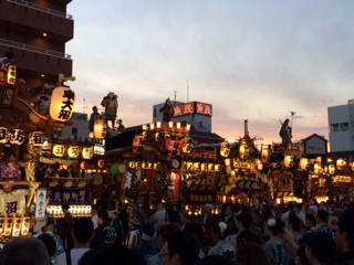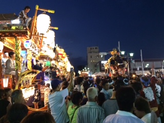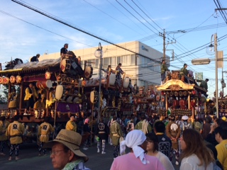 夜の帳が降りてくる中で、駅前のお祭り広場に集まった13の山車。それぞれがそれぞれの個性を誇らしく主張しながら奏でる強烈なたたき合い。その自己主張が全体としての調和を生み出している様子は、これからの学校や社会が目指す方向でもあると感じました。