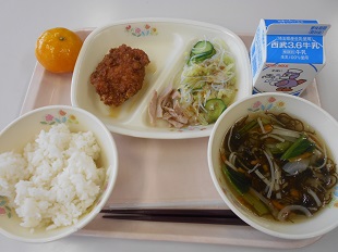 今日の給食は、カツ丼、牛乳、はるさめサラダ、もずくのスープ、冷凍みかんです。