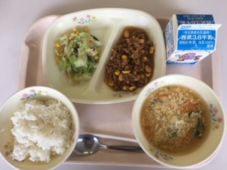 今日の給食は、ソイ丼、牛乳、三食サラダ、かき玉汁 です。
