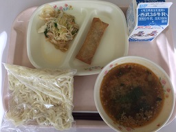 今日の給食は、担々麺、牛乳、春巻き、ネギじゃこナムル です。