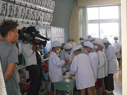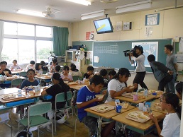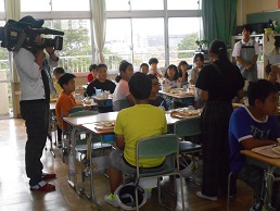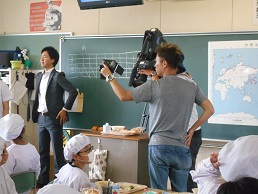 本日、ラグビーワールドカップ献立で『ボルシチ』を出しました。詳しくは、トップページ右側の「今日の給食」をご覧ください。その取材にテレビ埼玉が来てくださいました。今日は、5年1組の教室に入っての取材となりました。給食の残りが全然なく、今日もおいしい給食をたくさんいただいていました。ボルシチもおかわりする子がいて、大食缶に何一つない状態にきれいになっていました。