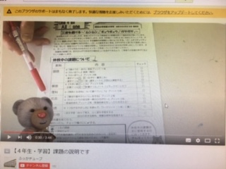 本日、4年生の担任から先日配付したプリント等の課題の説明の動画を送信しました。今回も限定公開とさせていただきますので、本校のご家庭の方しか見ることができません。