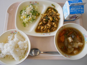 今日の給食は、ソイ丼、牛乳、けんちん汁、たくあんサラダ です。