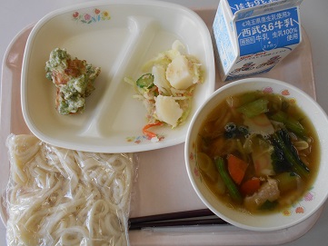 今日の給食は、 深谷葱たっぷりうどん、牛乳、竹輪の磯辺揚げ、ツナとポテトのミックスサラダ です。