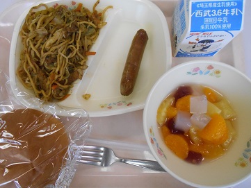 今日の給食は、子供パン、牛乳、焼きそば、焼きフランク、フルーツポンチ です。
