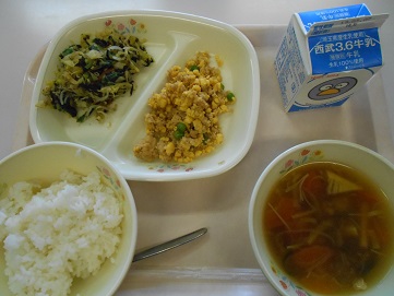 今日の給食は、三色そぼろご飯、牛乳、磯の香和え、のっぺい汁 です。