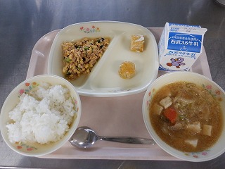 今日の献立は、三食そぼろごはん・にんじんしゅうまい・