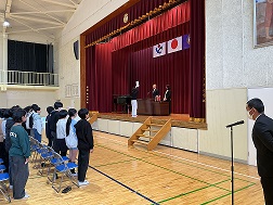 理科支援員さんが今年度最後の勤務日でしたので、小学校で学習した内容を使った「科学マジック」を披露してくれました。混ざらない色水(比重)、水面上昇(水に溶けやすい気体、熱膨張)など、不思議な現象も「理科の学習を使えば説明できる」ことがわかりました。中学校でもいろいろなことに興味関心をもって頑張ってください。