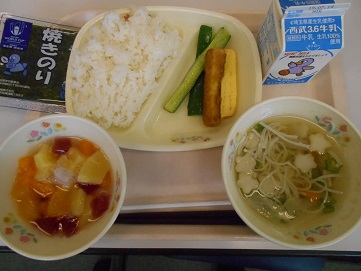 今日の給食は、手巻き寿司、牛乳、具(たまご いか きゅうり)、七夕スープ、フルーツポンチ です。