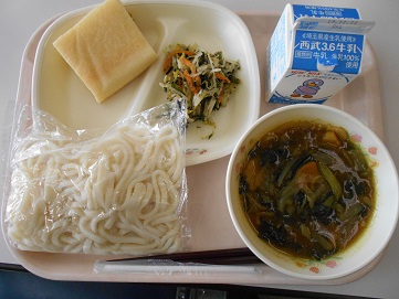 今日の給食は、カレーうどん、牛乳、りんごパンケーキ、磯の香和え です。