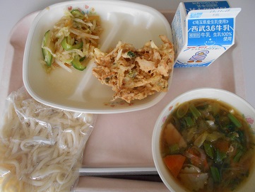 今日の給食は、深谷ねぎたっぷりうどん、牛乳、かきあげ、柿と大根サラダ です。