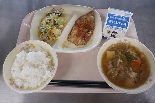 今日の献立は、ごはん・いわしのかば焼き・野菜炒め・
