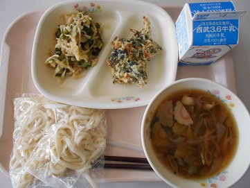 今日の給食は、深谷ネギたっぷりうどん、牛乳、ほうれん草のかき揚げ、和風サラダ です。
