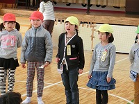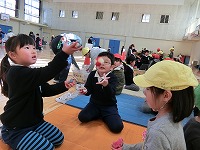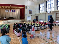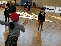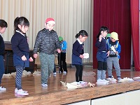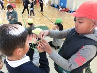 1月18日、『むかし遊び』の教室となる体育館に園児たちがやってきて1年生の”先生”たちの授業が始まりました。