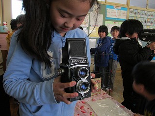 昨日2年生の児童のご家庭から貸していただいた、昔の道具を子どもたちに披露しました!すると・・・、「押し切り」という家畜の飼料を切る道具の大きさに驚いたり、昭和30年~40年代のカメラを持ってみて、「重い!」「かっこいい!」など、初めて見る道具に大感激でした☆子どもたちが「今」を「昔」から見つめ直すとってもよい機会となっていたようです絵文字:キラキラ