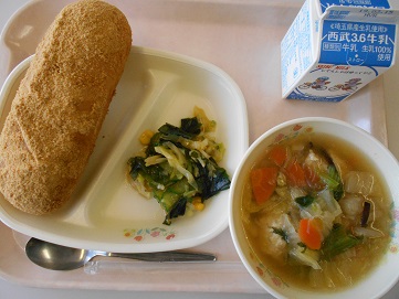 今日の給食は、ゴマきなこ揚げパン、牛乳、白菜と肉団子のスープ、海藻サラダ です。