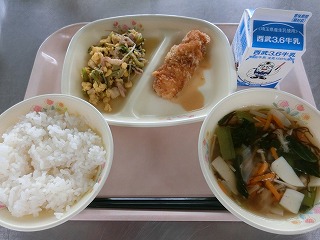 きょうの献立は、ごはん・ホルモン揚げ・ゴーヤチャンプルー・