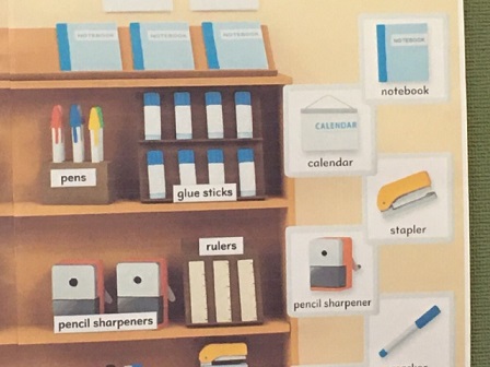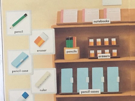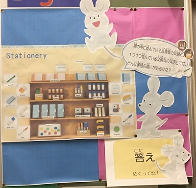 今、英語コーナーは、Stationery(文房具)についての掲示となっています。