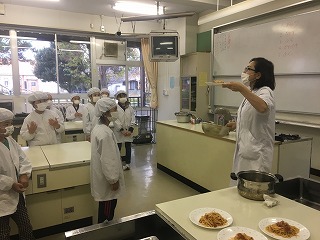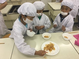 栄養教諭の佐々木先生に、パスタを茹でてもらい、2年生が協力してパスタを皿によそいました。