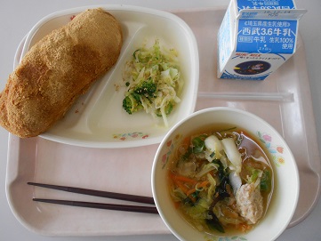 今日の給食は、 きなこ揚げパン、牛乳、セサミサラダ、白菜と肉団子のスープ です。