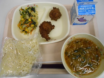 今日の給食は、キムチ入りごま味噌ラーメン、牛乳、おからドーナツ、小松菜とじゃこの炒り煮 です。