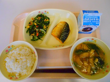 今日の給食は、ごはん、牛乳、鯖の塩焼き、ほうれん草のソテー、お月見汁 です。