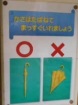 本校の子供たちは、くつ、傘の整頓が大変上手です。1年生のときからずっとしっかりしているので、自然と くつのかかとを揃えて入れますし、傘もしっかり束ねて入れられます。