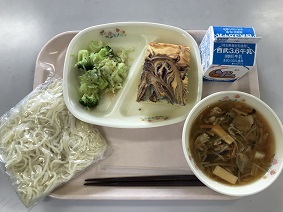 今日の給食は、サンマーメン・牛乳・ブルーベリーパンケーキ・温野菜でした。