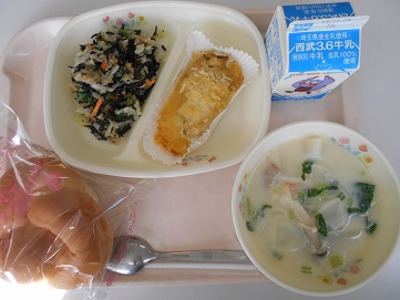 今日の給食は、フラワーロールパン、牛乳、チキンの香味焼き、ツナとひじきのサラダ、カブと豆乳のスープ です。