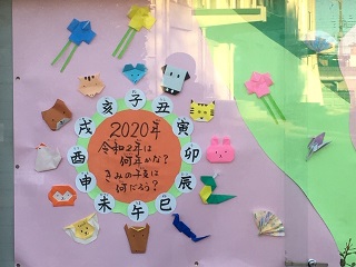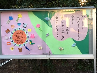 1月になってから正門の掲示板が変わりました。正月にちなんだ掲示となっています。