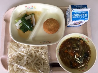 今日の給食は、カレーうどん、牛乳、ピロシキ、スティック野菜 です。