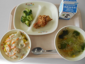 カレーピラフドリア風、牛乳、フライドチキン、ゆでブロッコリー、野菜のコンソメスープ です。