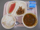 今日の給食のメニューは、ごはん、牛乳、夏野菜カレー、大豆のカリカリ揚げ、すいかです。