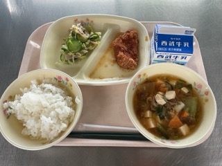 キャベツのペペロンチーノ・スタミナスープ・牛乳です。