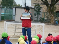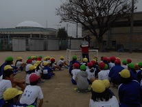 智形橋の補修工事が始まります。先日、校内放送でお知らせし、本日、すくすくタイムの後に校庭に集めて、関係の子供たちに話をしました。