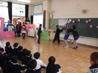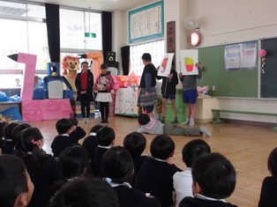 深谷小学校の保健委員会のお兄さん・お姉さんが先生になって、むし歯予防のお話をしに来てくれました。