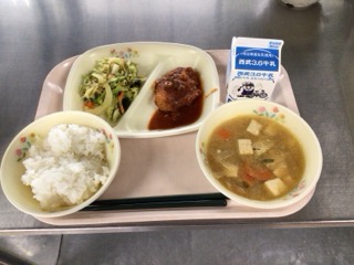 1月13日の献立は、ハンバーガー・蓮根サラダ・白玉雑煮・牛乳でした。